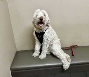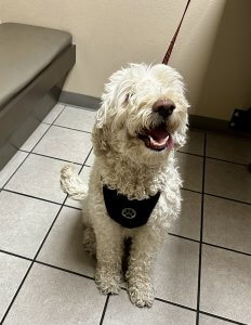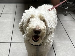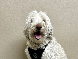 Atticus is believed to be around 5 years old, though we can’t say for certain. He’s a handsome white Goldendoodle with the fun-loving, energetic personality the breed is known for. Full of life and always ready for an adventure, Atticus brings a joyful spirit wherever he goes.